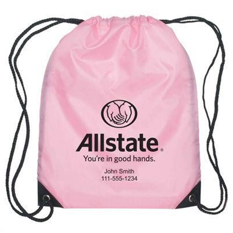 Nylon drawstring sports pack made of 210 denier nylon construction with contrasting simulated leather reinforcement black trim at the corners. Features the Allstate logo and agent copy in black.