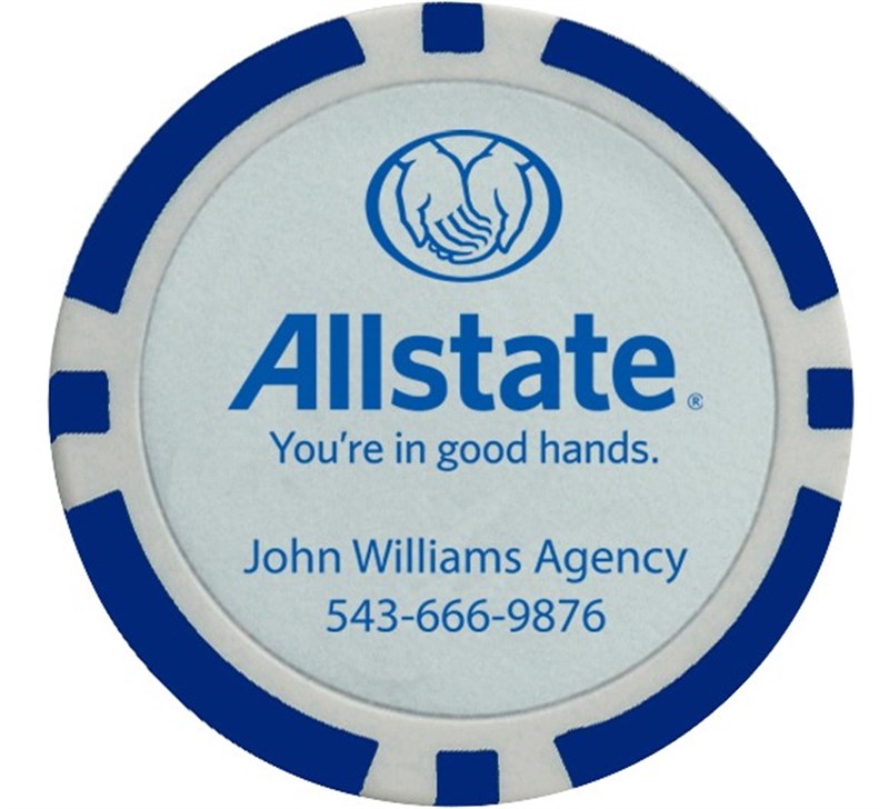 The poker chip ball marker is large enough to find in your pocket and easy to see on the green. These poker chips are printed directly on the chip. Imprinted with the Allstate vertical logo and 2 lines of agent personalization in blue. Personalization is optional. Chip is decorated on both sides.