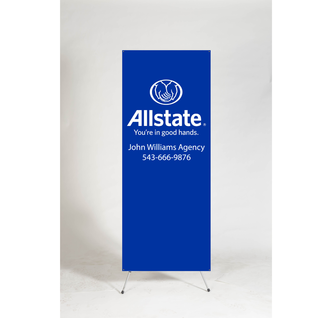 High-tech, lightweight, portable banner stand with quick set-up. Great for tradeshows, special events, and corporate events, and more. Includes travel case. Materials: 13 oz. Vinyl. Imprinted with the Allstate logo. 2 lines of agent copy can be added. If information NOT provided, banner will be produced with the Allstate logo only.