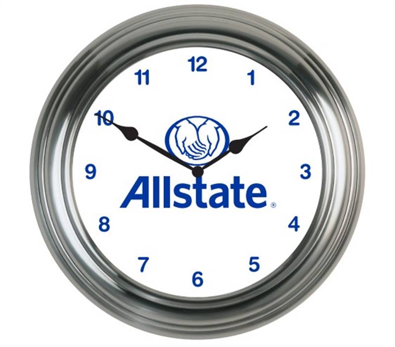 This clock features a bright silver finished case with a multibeveled edge and a clear lens. Decorated with the Allstate vertical logo with tagline in full color.
