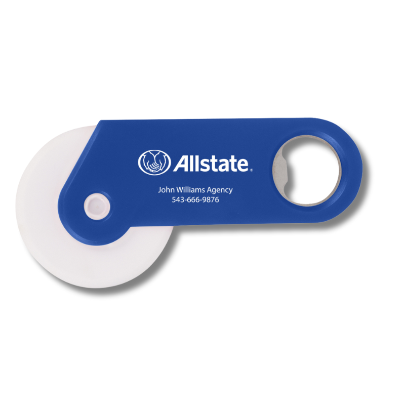 Pizza cutter and bottle opener that meets FDA requirements and is BPA free. Hand wash recommended. Imprinted with the Allstate logo and 2 line of agent information.