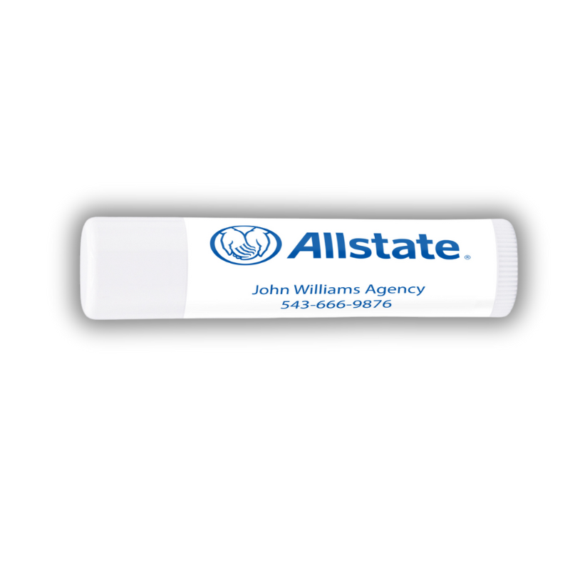 SPF 30 Broad Spectrum Lip Balm provides full protection against the effects of UVA and UVB rays. Our formula is inspired by high-end retail quality lip balms with beeswax, coconut oil, castor oil, cocoa butter, and shea butter. Features Allstate logo and 2 lines of agent information.