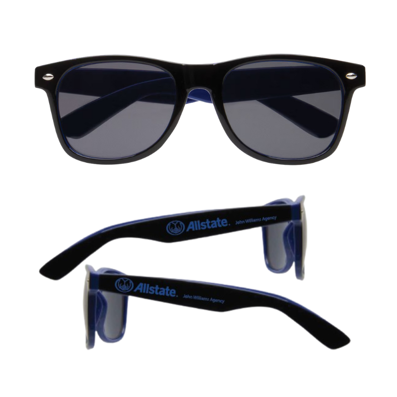 This two-toned color combination offers a colorful twist on the classic wayfarers. Each pair of sunglasses provides 100% UV protection and feature shatter resistant lenses. Features Allstate logo and agent information on both arms.