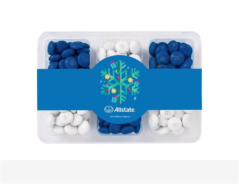 Sweeten the season with a compact treat that delivers big smiles! This mini tackle box filled with colorful M&M’S® features six candy compartments and a holiday themed sleeve with Allstate logo and 2 lines of agency information. Features white and blue candies for a festive, personalized touch—perfect for holiday gifting, celebrations, or cheerful direct mail surprises.