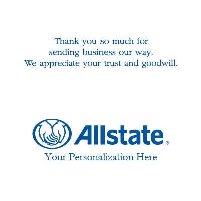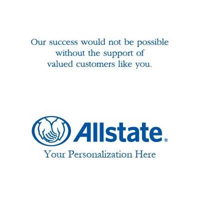 Thank You cards with your choice of paper stocks; includes company name, verse and envelopes.??Select the verse you would like to include in your card from the drop down above.? Includes silver lined envelope with the Allstate logo and return address.? This item must be ordered in increments of 25 This item is made to order. Please allow 3-4 weeks for delivery. Personalized items are not returnable or exchangeable. Please order carefully. Card Size: 5 1/2 " x 4 1/4 "