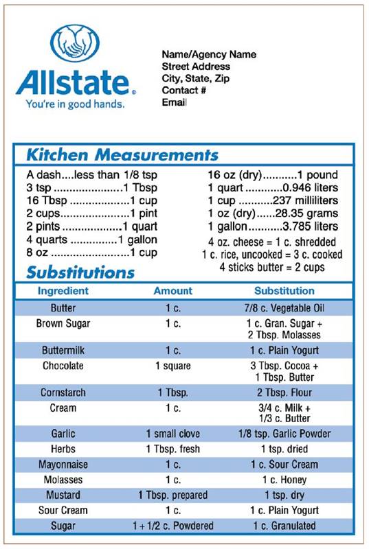 4" x 6" rectangle magnet lists kitchen measurements and food substitutions. Features the Allstate vertical logo and up to 9 lines of agent personalization.