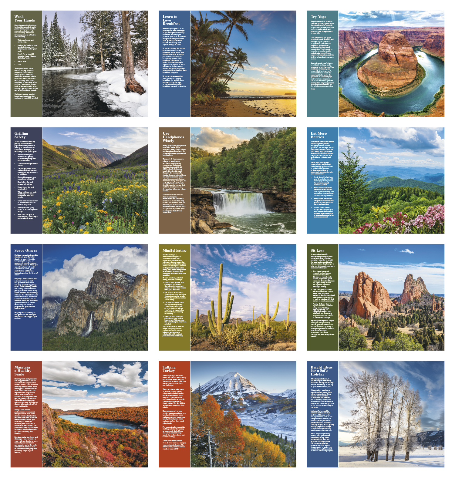 This calendar features images of majestic natural wonders plus healthy living tips. 13-Month calendar with December month printed on backmount. Gloss paper stock with UV coated cover. High-quality imagery.