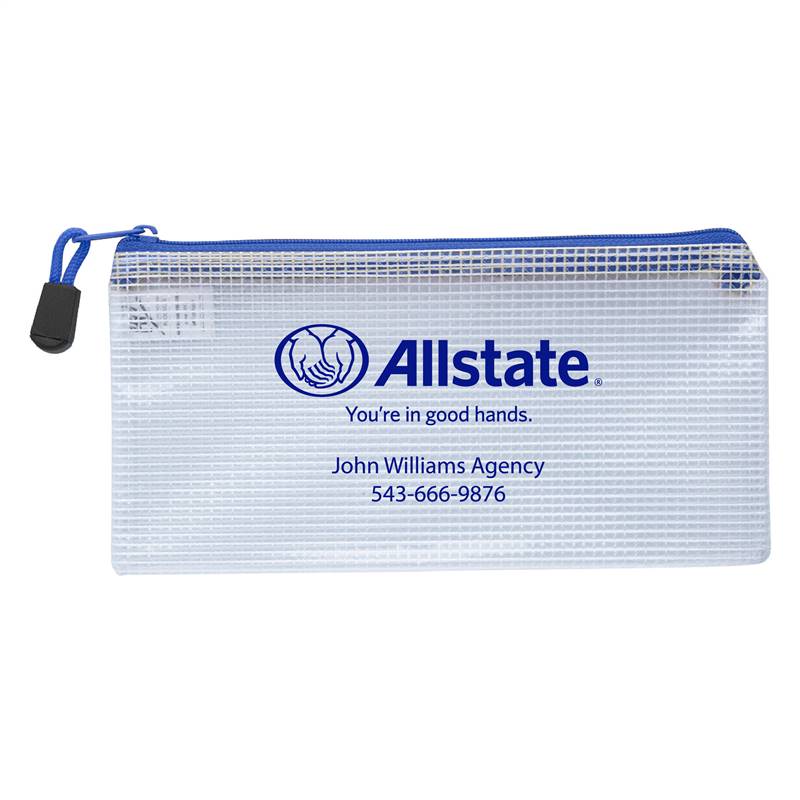 Made of water and stain resistant poly weaved durable plastic rib material. Holds pens, pencils, scissors, erasers and other essentials. Imprinted with the Allstate horizontal logo plus two lines of personalization. Personalization is optional.