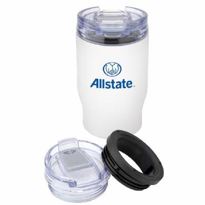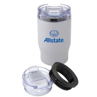 This 12oz copper lined, vacuum-insulated 3-in-1 tumbler maintains optimal drinking temperatures. Provides 8X heat retention. Stainless steel dual-wall construction includes 2 attachments: Black can/bottle ring holds a standard 12oz can or bottle, and spill-proof flip-top AS plastic lid featuring unique Tritan snap-locking closure. Sweat free design and spill proof top make it a perfect office accessory! This 3 in one tumbler transitions between poured drink insulated tumbler, 12oz can cooler and 12oz bottle cooler. Hand Wash only. Avoid submersion for extended periods.