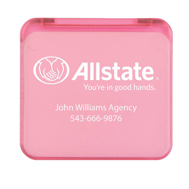 Includes 1x and 2x magnifications. Convenient travel size. Imprinted with the Allstate horizontal logo with tagline and 2 lines of agent personalization. Personalization is optional.Color: Translucent PinkProduct Dimensions: 2-1/2" x 2"Imprint Area: 2-1/4" x 2" This item is not returnable or exchangeable, as it is made to order. Please order carefully. Please allow 3-4 weeks for delivery.