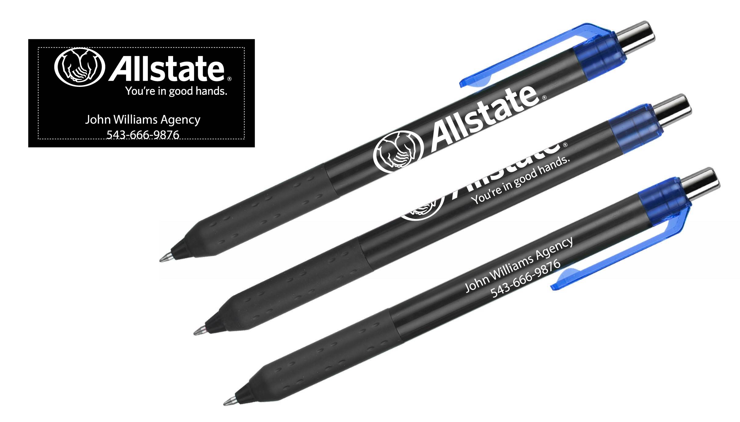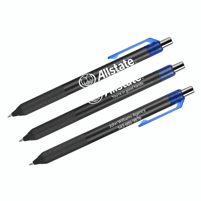 Retractable style. Secure-Rite, German anti-fraud ink in your choice of blue or black. Opaque clip. Co-molded soft grip goes all the way to the tip for comfortable writing. Printed with the Allstate horizontal logo with tagline and 2 lines of agent personalization. Personalization is optional.