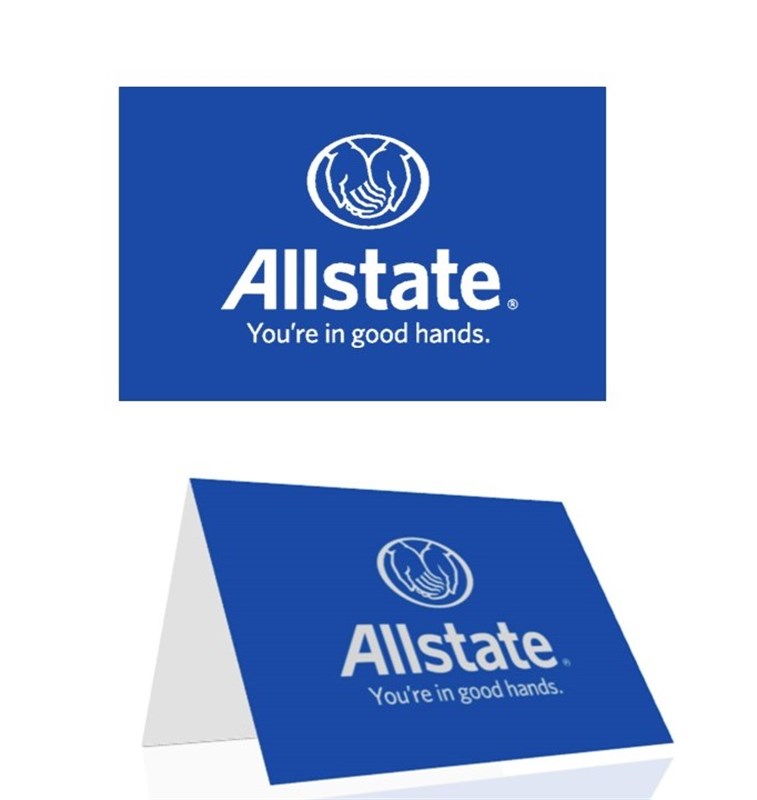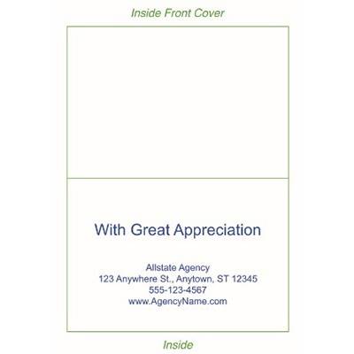 Custom business thank you cards. These folded 3-1/2" x 5" custom note cards are digitally printed in color on the front cover and inside. Inside Verse Reads: With Great Appreciation. Printed on white cardstock. White mailing envelopes included with return address. Cards are shipped flat. Printed with the Allstate vertical logo with tagline on front cover and four lines of agent personalization inside. Personalization is optional.
