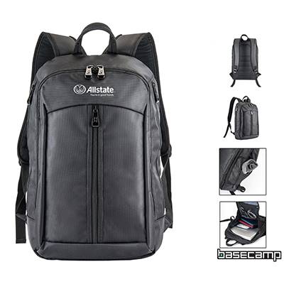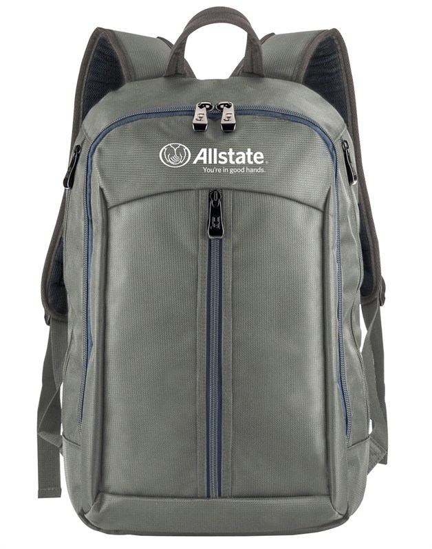 The everyday, go anywhere backpack! This gray backpack is made of sporty 1680 cross weave material. Features large front vertical zippered pocket, a main compartment with dual-zipper closure, two side zippered catch-all pockets, padded top handle and adjustable shoulder straps. Fits most 14" laptops. Features the Allstate horizontal logo with tagline printed in white.