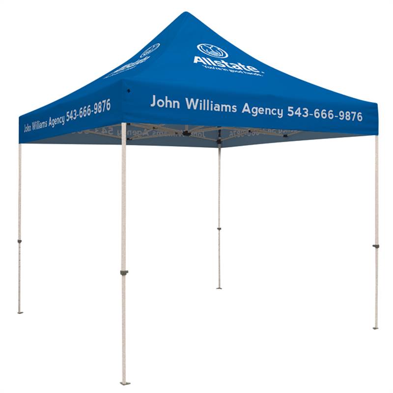 This sturdy, high quality tent measures 10' x 10' and is constructed with a powder-coated steel frame which features push buttons for a pinch-free setup. It also features a crank-up canopy for added tension. The canopy is made from high quality, flame retardant, weather-resistant, 400 denier polyester. The blue canopy features the Allstate logo printed on all four sides in white.