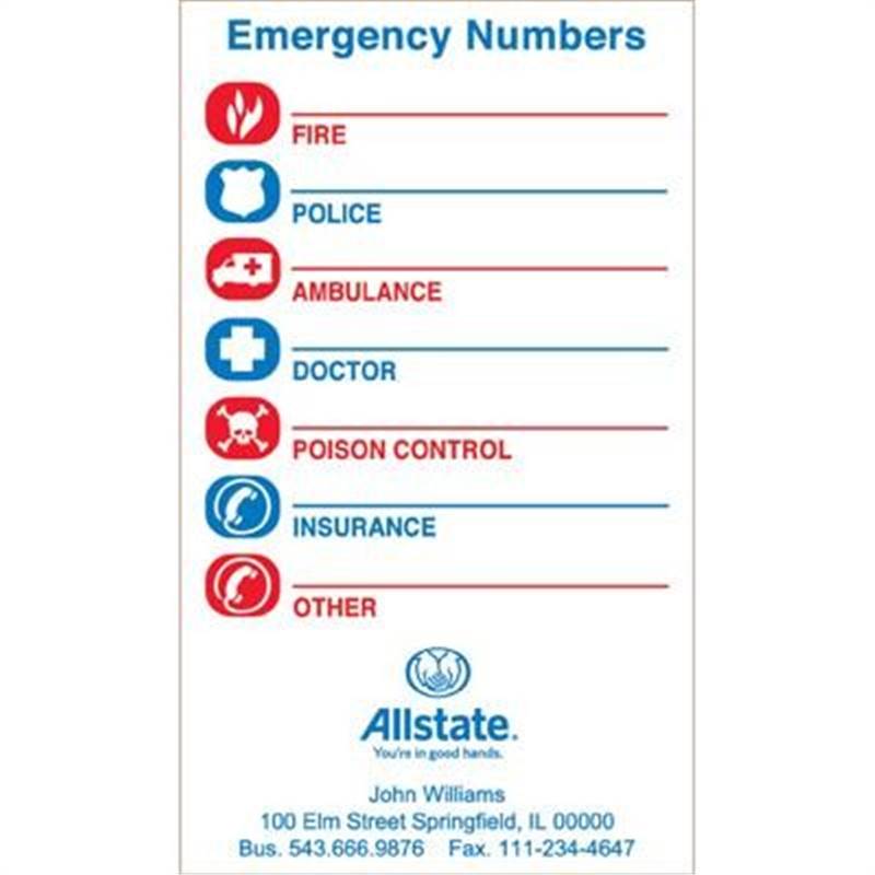 Give to clients so they always have critical phone numbers handy. A great idea for clients with children- the blank line can be used for an emergency contact for babysitters. Includes Allstate logo and agent imprint.