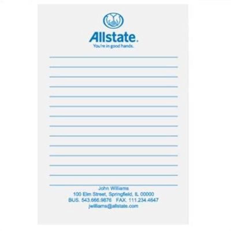 With plenty of room for your imprint as well as note taking, this 4" x 6" pad is a popular memo pad size. The adhesive edge is along the top (4" side). 25 sheets per pad, ruled lines included on each sheet. Allstate vertical logo with tagline and agent imprint.
