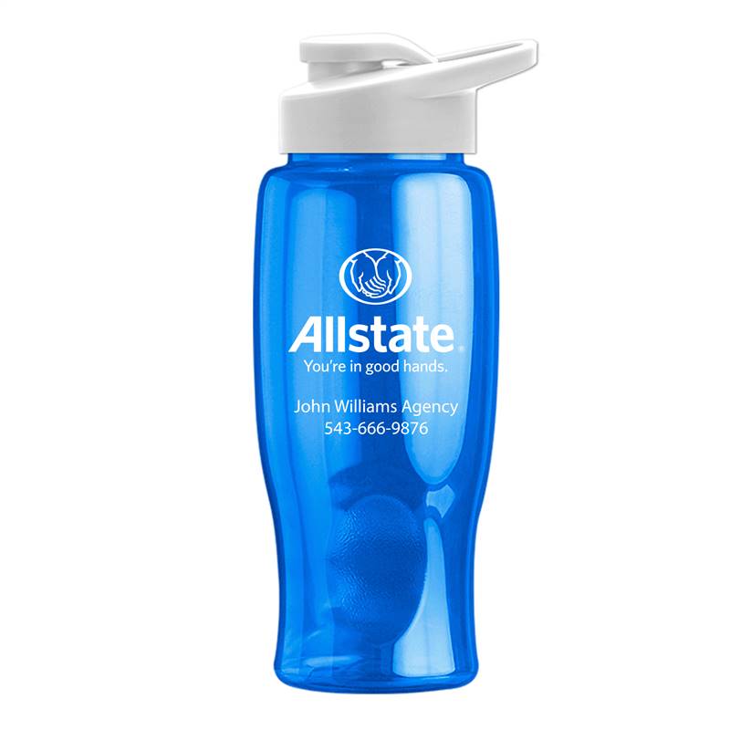 27 oz. transparent sport bottle with drink-thru lid has a contoured, tapered base to fit auto cupholders. Molded from food-safe BPA Free PETE. Hand wash recommended. Printed with the Allstate vertical logo with tagline and 2 lines of agent personalization. Personalization is optional. Must order in increments of 50.