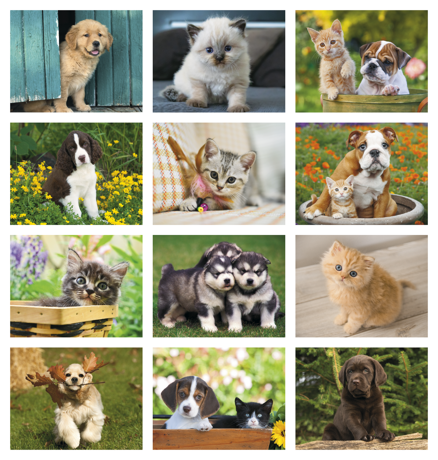 Playful images of puppies and kittens will delight all animal lovers. 13-month calendar.