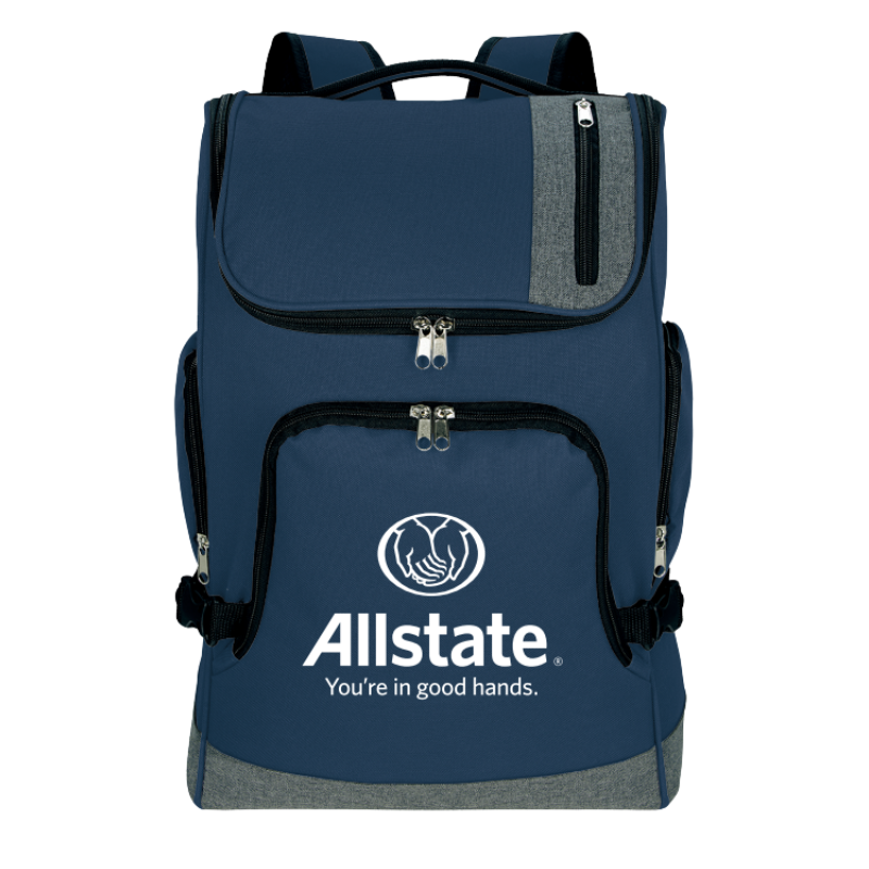 This backpack lets you carry your computer in style. Main zippered compartment large enough for all your belongings. Padded laptop compartment. Two front zippered pockets and two side zippered pockets. Side compression straps. Padded adjustable shoulder straps. Imprinted with the Allstate vertical logo.