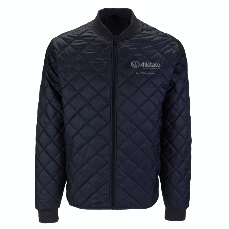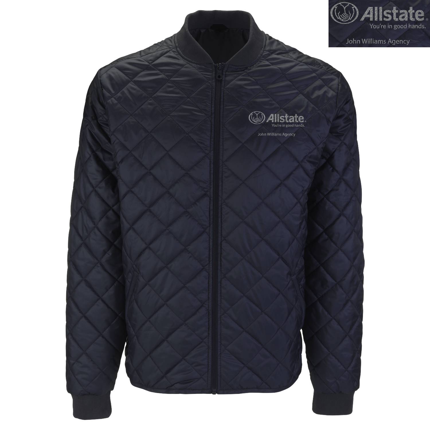 Jet about town in a convenient layer that's high on style and fast with function. 100% polyester mini ripstop diamond quilted body with water-repellent finish, forward shoulder, rib collar and cuffs, even-hem bottom with self-goods binding. Folds into pocket self-pouch. Embroidered with the Allstate horizontal logo plus 1 line of personalization in silver. Size Large out of stock until June. Personalization is optional.