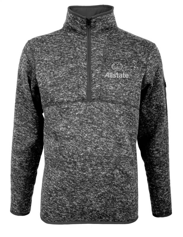 100% polyester brushed back heather sweater knit with dyed to match cover stitch and binding at collar, cuff, and bottom hem features heat transferred Allstate logo. Welded sleeve pocket with zipper & rubber Antigua logo patch at back neck. It is recommended that you wash inside out.
