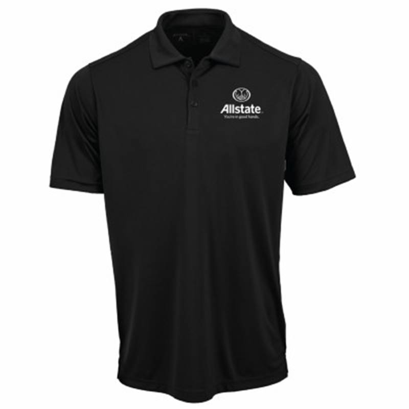 100% polyester Desert Dry moisture wicking interlock knit solid short sleeve polo with self-fabric collar, open cuff, narrow 3-button placket, and side slits. Antigua triangle patch at right sleeve. Embroidered with the Allstate vertical logo in white.