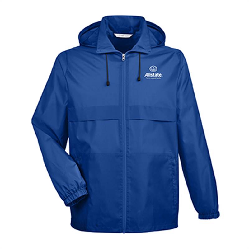 1.7 oz./yd2/58 gsm, 100% polyester taffeta. Water-resistant finish. Center front coil zipper with autolock slider. Lower front concealed zippered pockets. Elasticized cuffs. Rollaway adjustable hood. Adjustable shockcord at hem. Embroidered with the Allstate vertical logo in white.