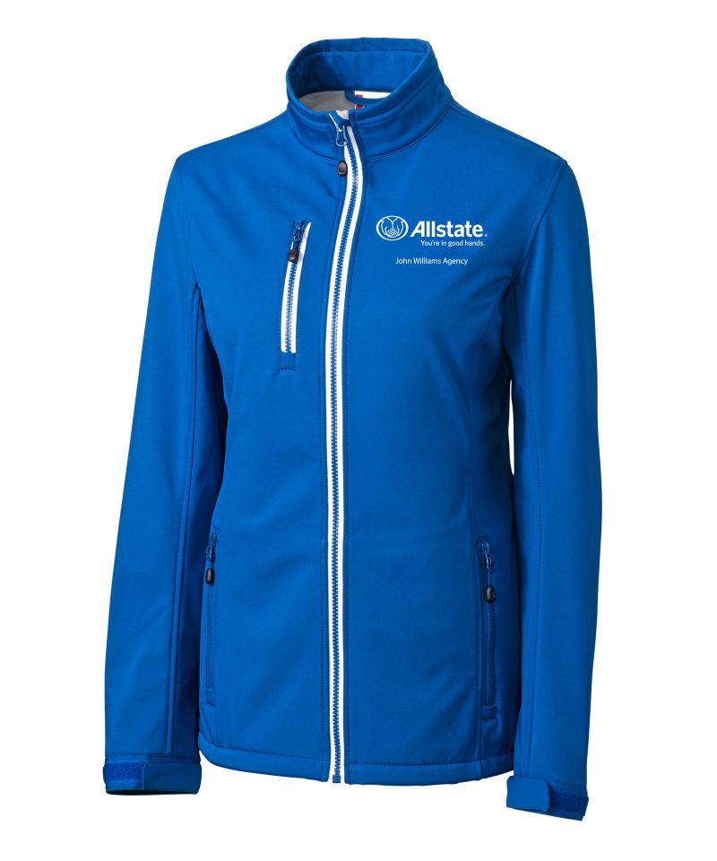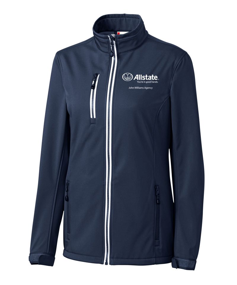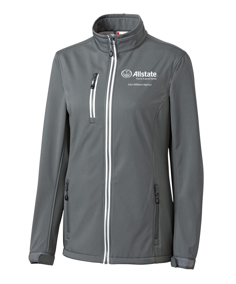 96% Polyester, 4% Spandex, High-Performance softshell, Waterproof to 1,000mm, Mock neck, Microfleece lining, Elasticized cuffs. Features the Allstate logo Agency Name embroidered on the left chest.