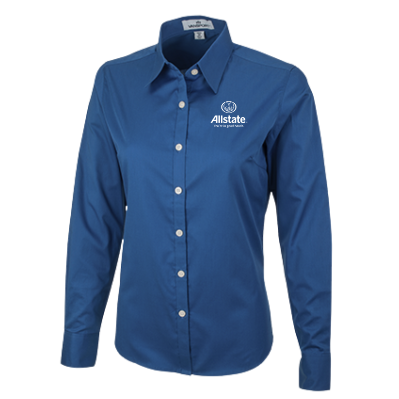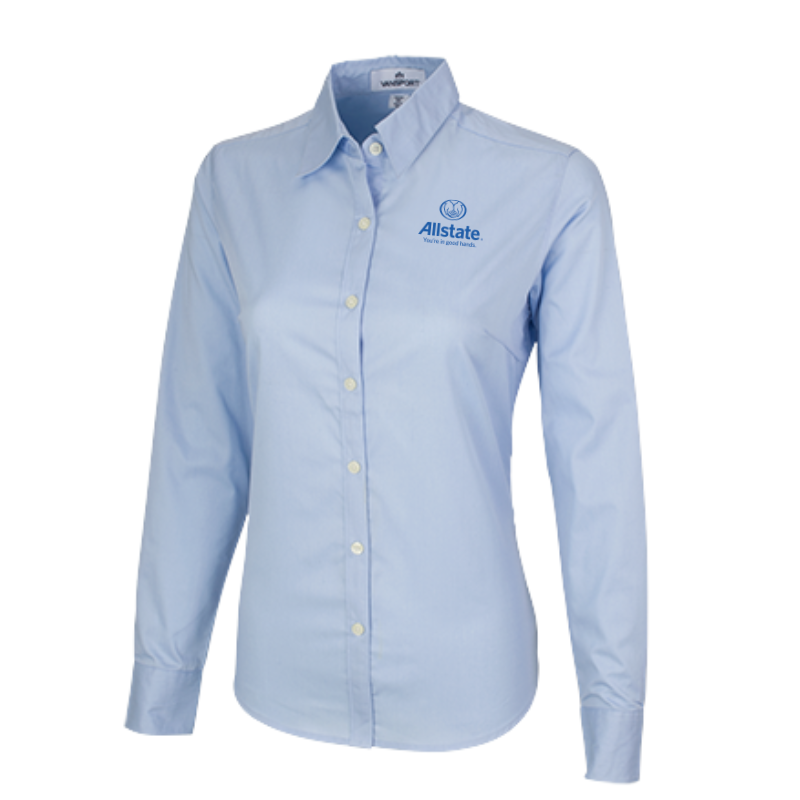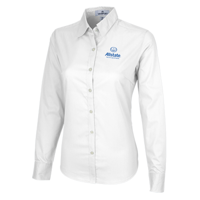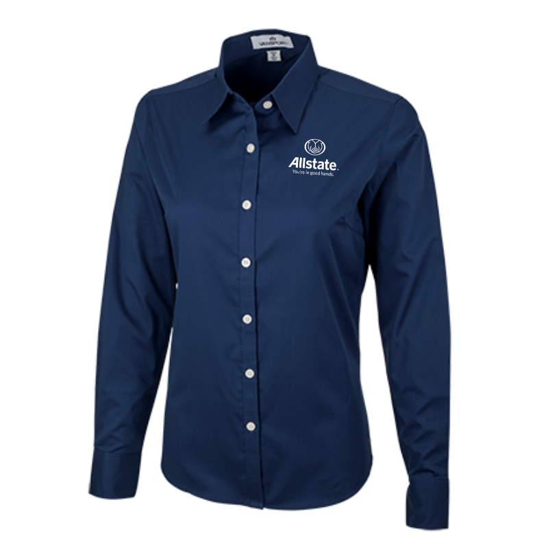 Keep your cool in this cotton-rich, moisture-wicking performance dress shirt. Easy-care fabric means you're meeting ready with a quick wash and dry and very little ironing, if any! 55% cotton/45% polyester, 3 1/2 oz. Vansport™ moisture management twill body, UV protection, spread collar, narrow reverse placket, polished buttons, bust darts, single-needle tailoring, back yoke, buttoning sleeve placket and cuff, replacement buttons. Imported. Embroidered with the Allstate logo. This item is non-returnable or exchangeable, as it is made to order. Please order carefully. Allow 3-4 weeks for delivery.