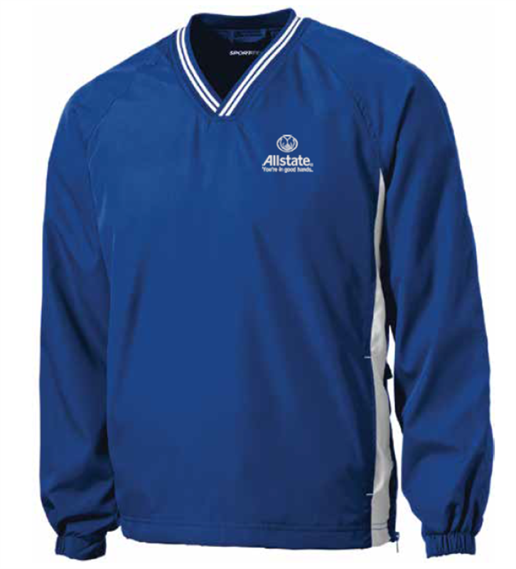 Conquer windy days in style with our water-repellent wind shirt. Made from 100% polyester, it's lightweight and soft to the touch. The rib knit v-neck collar and raglan sleeves ensure a comfortable fit and easy movement. With color blocked side panels and tipping on the collar, Stay comfortable with the half elastic, half self-fabric cuffs and drawcord hem with toggles. Stay cool with the mesh insets at the gussets. Get ready to take on the wind with a sleek and functional wind shirt. Features Allstate logo with tagline embroidered on the left chest in white.